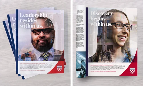 Custom profile photography of key figures in each program was mixed with existing imagery of campus, and architectural renderings to create a complete picture of what donors would be contributing to.